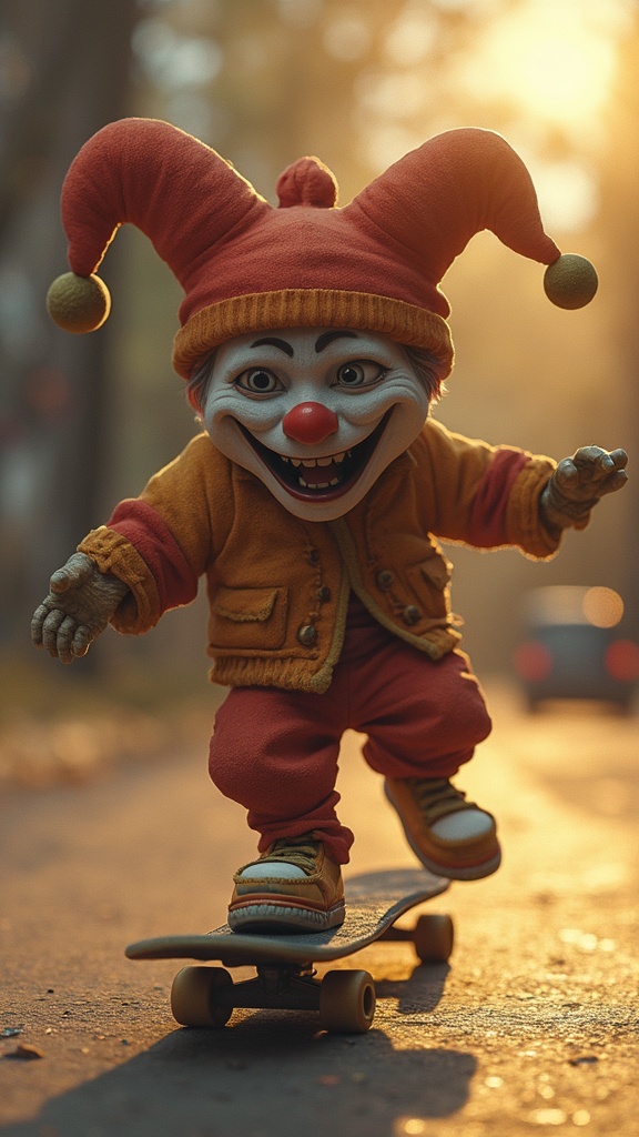 View this AI-generated image featuring whimsical skateboarding jester digital artwork in 3d blending modern aesthetics high contrast imagery with deep shadows and radiant golden tones. Created using advanced AI technology, this image showcases creative visuals, AI artwork. Perfect for creative proje