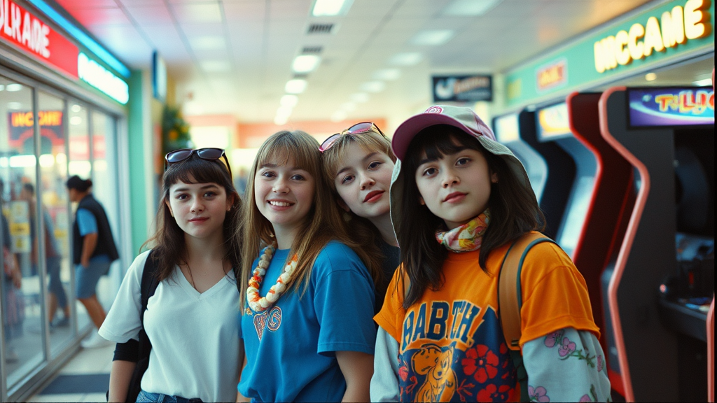 Whimsical snapshots of 90’s mall teens sporting nostalgic attire, captured with the nostalgic grain of vintage VHS footage, set against the backdrop of colorful storefronts and buzzing arcade vibes.
