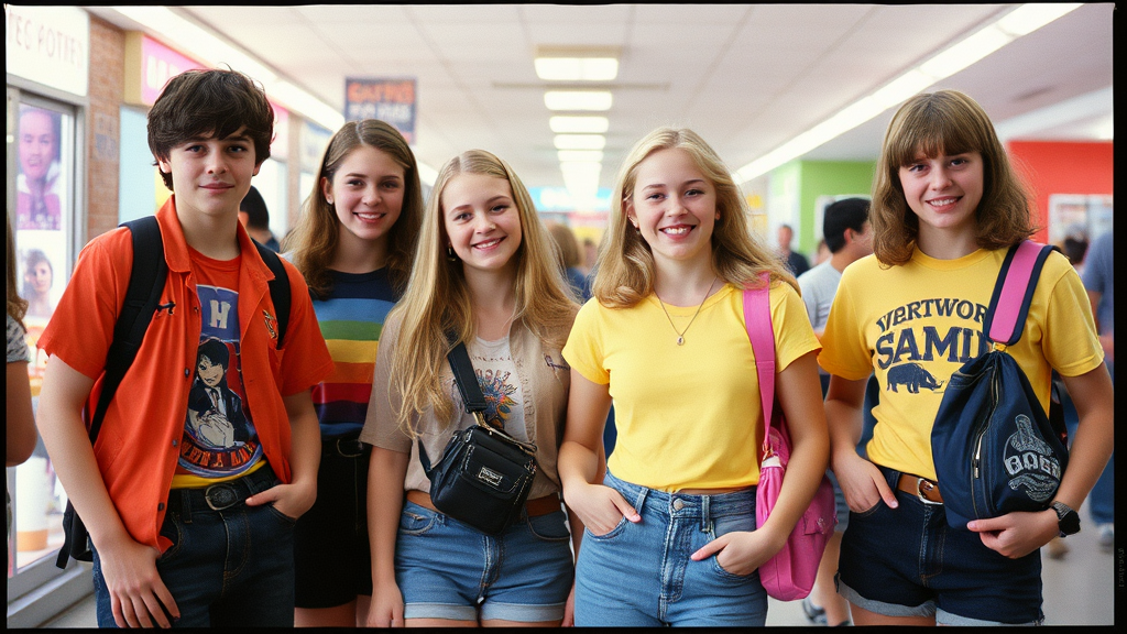Whimsical snapshots of '90s teens in vibrant retro mall attire, captured with the nostalgic grain of VHS tape, exuding quirky charm and carefree adolescence.