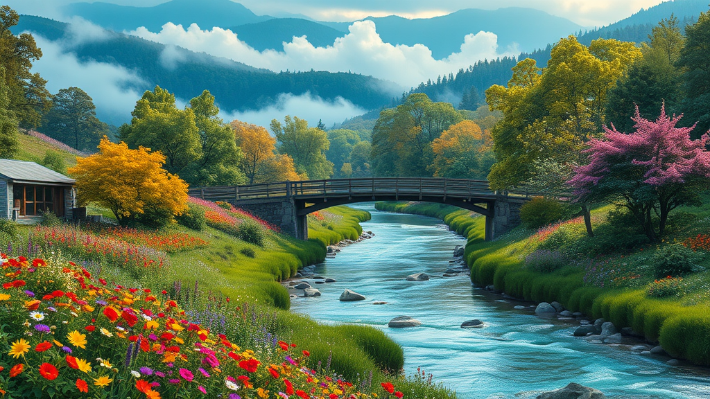 Whimsical valley serene with riotous blooms of wildflowers surrounding crystal clear river winding lazily through landscape of towering trees with leafy canopies in shades of emerald and sapphire shimmering with dew, oak wooden bridge arching above the river, bordering misty fog rolling upstream, clouds drifting listlessly across the matte cerulean sky.