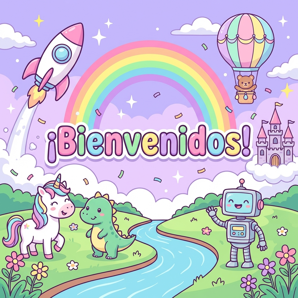 A vibrant, cute cartoon illustration featuring the word '¡Bienvenidos!' in colorful puffy letters, surrounded by a magical landscape. A rainbow arches over a rocket, hot air balloon, castle, unicorn, dinosaur, and friendly robot, all in a whimsical, pastel setting.