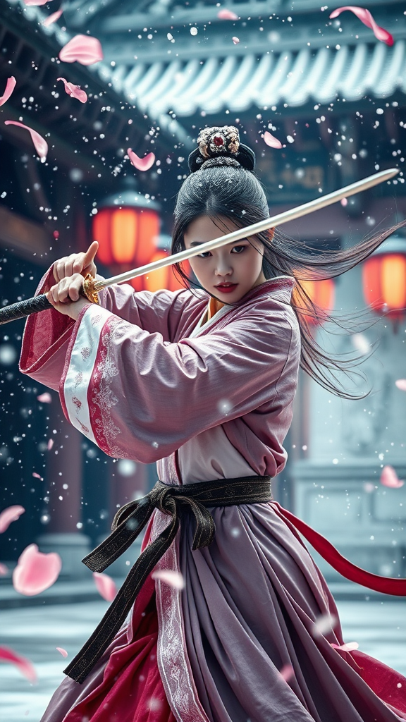 Whirling snow intermingles with petals in the air as a 16-year-old Chinese girl clad in exquisite Hanfu artfully wields a sword, her movements graceful yet fierce in the heart of an ancient temple. The panoramic view captures the cinematic drama, as she executes her martial arts-inspired swordplay with precision. The background shimmers with colorful, ethereal lights, enhancing the fairy tale atmosphere. Every detail is meticulously rendered, from the intricate folds of her attire to the play of light and shadow across her face, creating a dynamic and breathtakingly realistic scene reminiscent of a 35mm film shot.