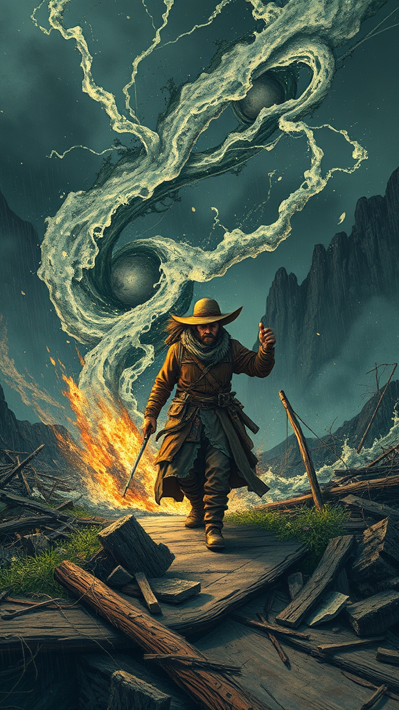 Whirlwind Twister Repairman: a determined and skilled individual travels through storm-ravaged landscapes, harnessing the power of the elements to mend and restore what nature has taken, leaving trails of healing calm in their wake.