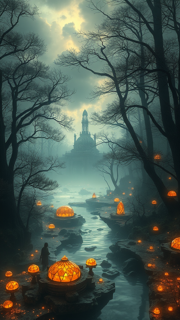 Whispering forests shrouded in fog, where enigmatic witches weave their magic amidst the high contrast of light and shadow, creating a surreal, photo-real scene. Ethereal forms flow like blowing lights through a landscape both deformed and sketched, where water merges with industrial elements. Glimmers of gold and crystals emerge like precious jewelry from the earth, nestled among mystic gems. This fantastical world teeters on the edge of cyberpunk and steampunk, filled with detailed concept art reminiscent of Alice in Wonderland's whimsy. Loud clouds clash in a storm above, casting shadows on a horizon where modern and old architecture meet, their ivory and marble facades a vision of paradise. The scene is mind-blowing, an organic fusion of rusted textures and pristine beauty, captured in stunning 4k resolution. The masterpiece is rendered in octane, every detail in HDR, creating an immersive experience of otherworldly proportions.