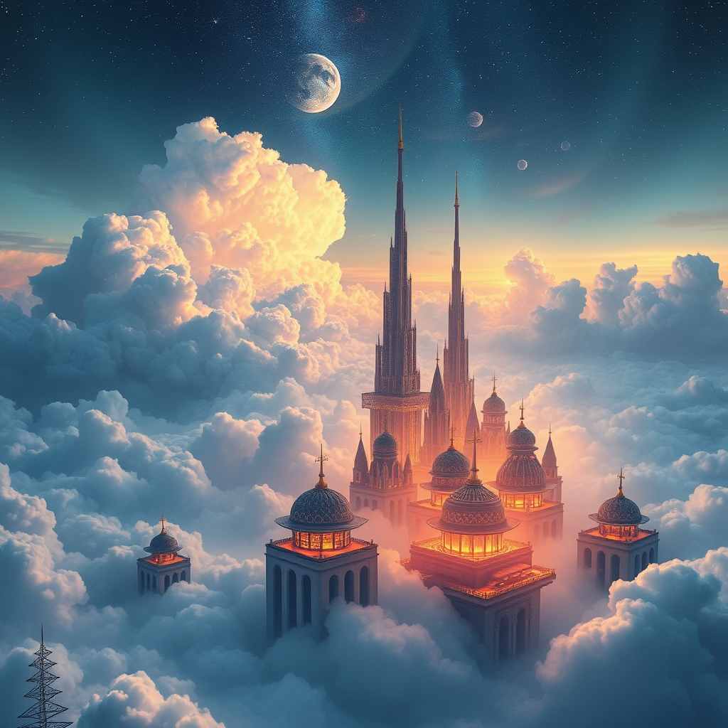 Whispering Skies of Celestia:Dreamforest altocumulus cityscape amidst ethereal nebulae formations within liquid crystalline clouds,polyhedral structures pierce the auroral veil,dining arcades perched on streamlined plinthsrest upon the drizzling wisps of atmospheric diaphaneity, attitudes shifting precipitously amidst ornateomics of animate cosmogony.