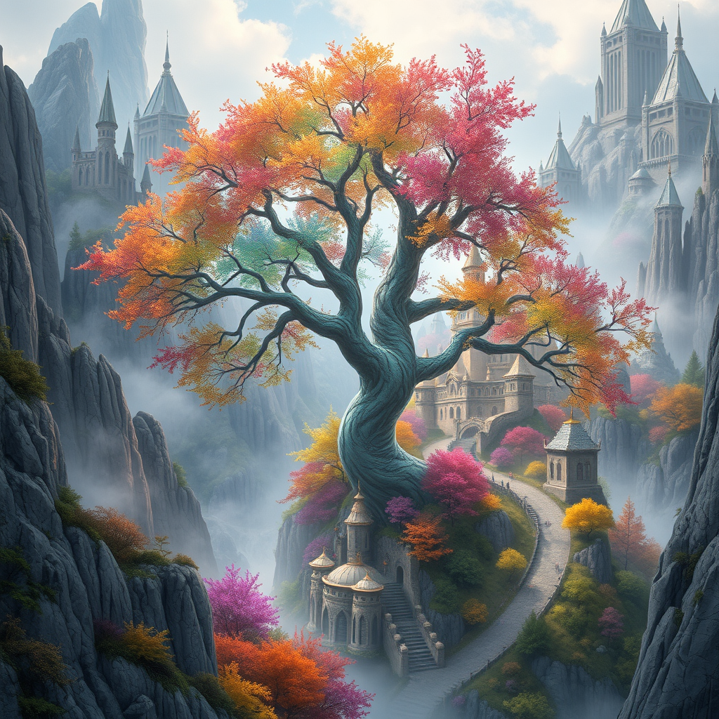 Whispering Windhaven, a mystical fae metropolis sprawls across the mist-shrouded valley, cradled by towering crystal cliffs that ascend like shards of splintered sky, their rugged facades reflecting the kaleidoscope hues of the multicolored trees that sway above, their delicate branches etched with delicate vines that shimmer like stardust. At the heart of the city, the Glimmering Sceptre tree, an ancient, sentient giant with bark as white as alabaster and leaves that rustle with a soft, ethereal music, towers above the landscape, its canopy a kaleidoscope of emerald, sapphire, and amber. Surrounding the Sceptre, the city's fae inhabitants weave their enchanted architecture, grand estates and winding canals that mirror the dreams of the forest, while the grand, iridescent castle, with towers that shimmer like the moon and a moat of liquid silver, dominates the horizon, its delicate spires and grand halls whispering secrets to the wind. Waterfalls cascade down the crystal cliffs, their crystal veins infused with the essence of the forest, their songs a soothing melody that harmonizes the very essence of Windhaven, as the trees, infused with magic, begin to change color with the passage of time, reflecting the ebbs and flows of the city's enchantment, a place where the boundaries between reality and myth blur, where the fae and mortal coexist in harmony, and the rhythm of the forest whispers ancient wisdom to those who listen.