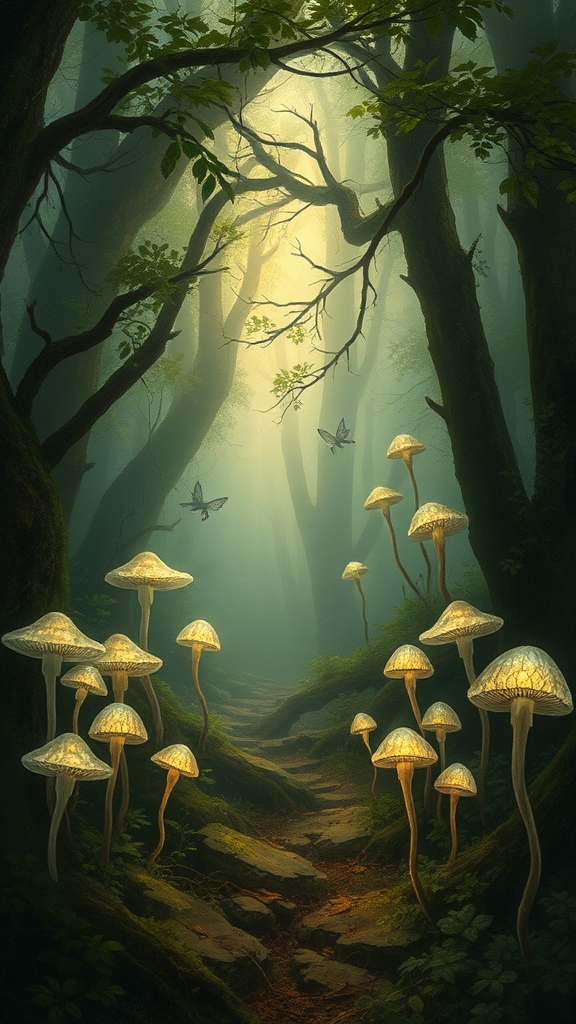Whispering woods artwork in the style of a Renaissance fantasy, an ethereal painting of a mystical fairy forest illuminated by soft, otherworldly light, set amidst a tapestry of crystal-like mushrooms and leafy greenery, mired in a soft, crepuscular hue.