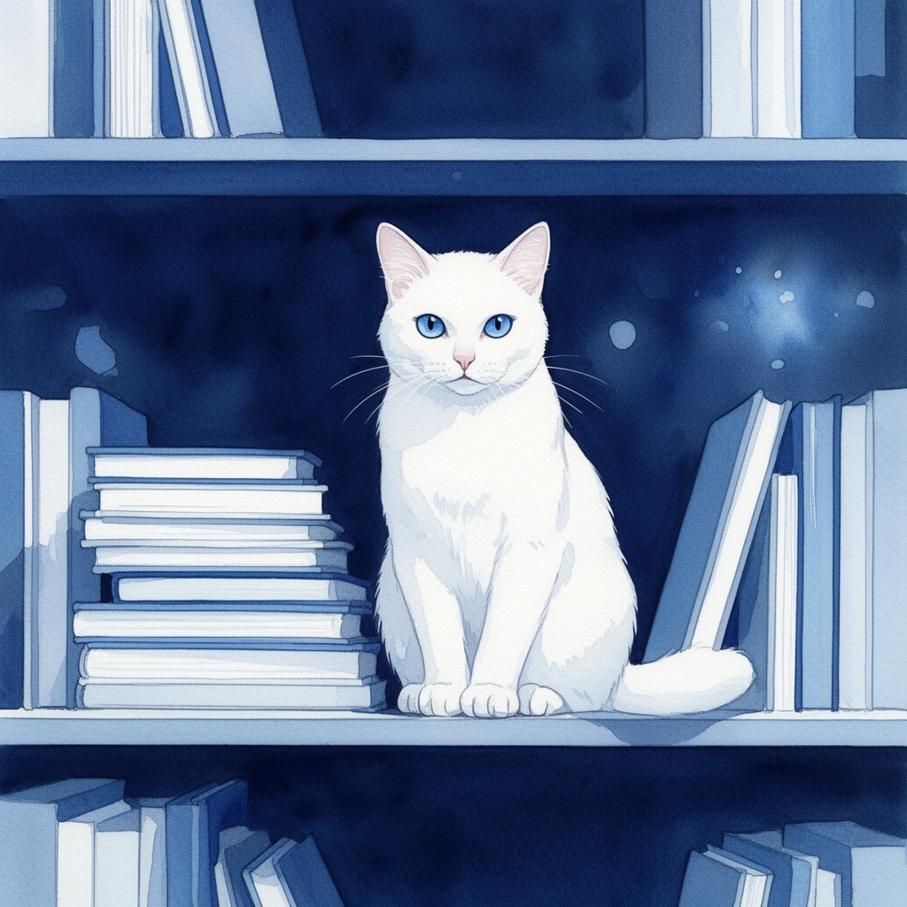 Watercolor painting of a white cat with piercing blue eyes sitting on a bookshelf, looking directly at the viewer. The cat is surrounded by stacks of books in varying shades of blue and white. The background is a deep, dark blue, with subtle light blue highlights suggesting reflections. The lighting is soft and ambient, casting gentle shadows that enhance the depth. The overall mood is serene and peaceful. The color palette is dominated by blues, ranging from light sky blue to deep indigo, with the white cat standing out. The art style is minimalist and clean, resembling a traditional watercolor illustration.