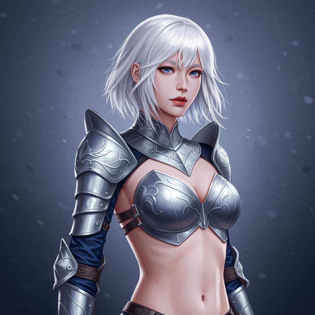 View this AI-generated image featuring white hair elaborate silver blue armor captivating exquisite face stunning young south korean woman shoulder length silver hair defined stomach midriff exposed hyperrealism inspired by the style of greg rutkowski 8k resolution ethereal elegance. Created using a