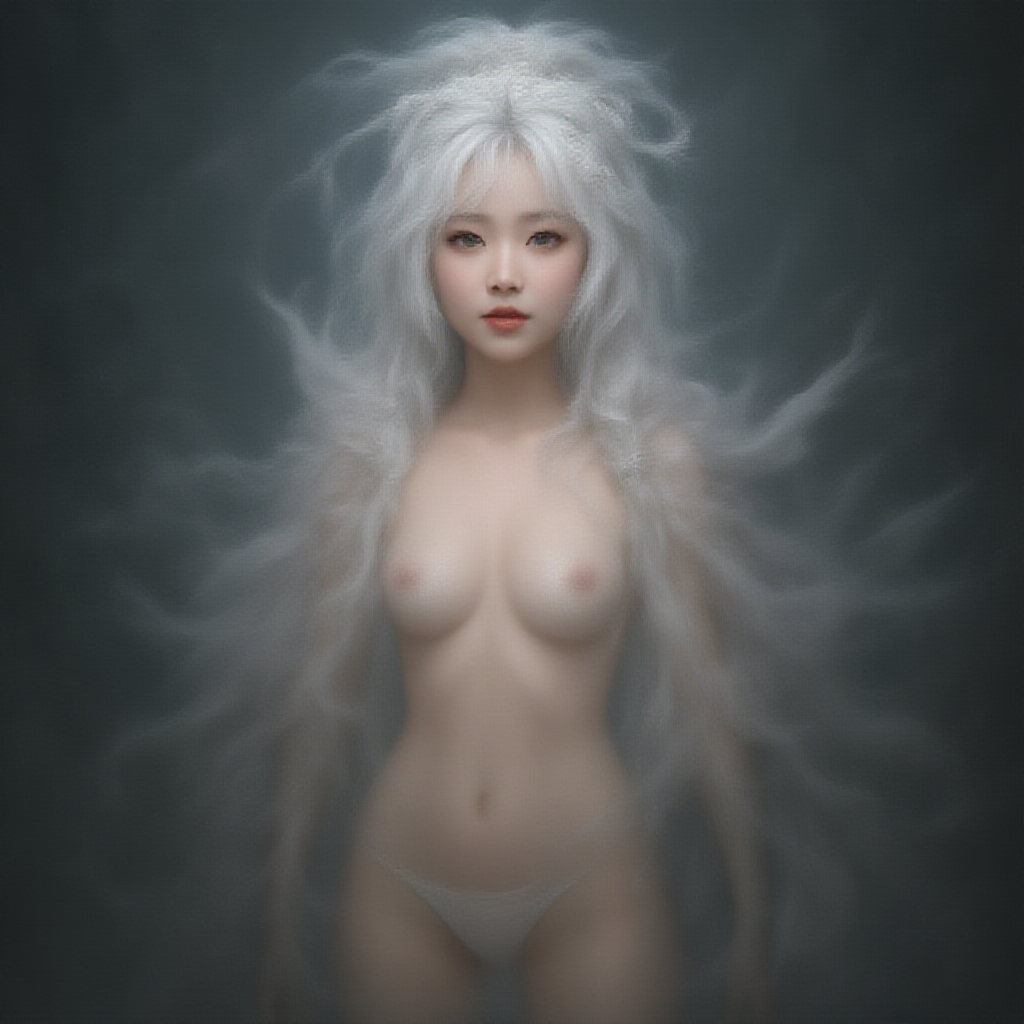 White hair, exquisitely detailed face, captivating young Asian woman, queen of the afterlife, medium-length silvery locks, sculpted midsection, midriff revealed, petite figure, set against a fantasy backdrop, Hyperrealism style, cinematic illumination, intricately designed, awe-inspiring, photo-realistic environment, wide-angle perspective, reminiscent of works by Greg Rutkowski and Magali Villeneuve, CGI, 3D render, doll-like quality, Octane render, embracing artistic creativity with surreal elements, abstract anatomy, fluid forms, dreamlike blur, imaginative distortion.