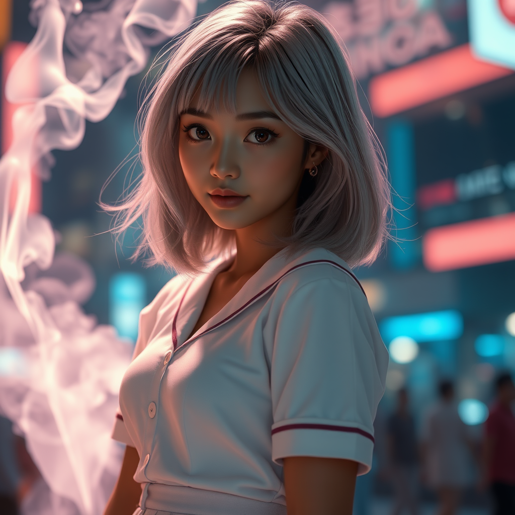 White hair of a stunning young Asian girl cascades down her back like a river of moonlight, framing her delicate features and piercing brown eyes that sparkle like polished obsidian. Her olive skin glows with a soft, ethereal luminosity, as if kissed by the divine. Her medium length hair is styled in loose, effortless waves that frame her petite face and accentuate her small, pert breasts. Her toned body is clad in a crisp, white school girl uniform that hints at her innocence and youth. The fitted skirt rides up her midriff, revealing a sliver of pale skin that glows like alabaster in the dim light. Her face is a perfect heart-shaped heart, with high cheekbones and a small, button nose that adds to her adorable, elfin charm. Behind her, a swirl of neon light smoke dances in the air, illuminated by the vibrant colors of a cityscape that blurs and fades into the background. Volumetric fog wafts through the scene, imbuing the atmosphere with a sense of mystery and enchantment. The hyperrealistic details and cinematic lighting create an otherworldly ambiance, as if the girl has stepped out of a dream and into the real world. Every detail, from the delicate lace trim on her uniform to the sparkle in her eye, is so finely rendered that it feels almost lifelike. In 8K UHD resolution, every nuance and texture is breathtakingly clear, making the viewer feel like they're gazing upon a work of art come to life.