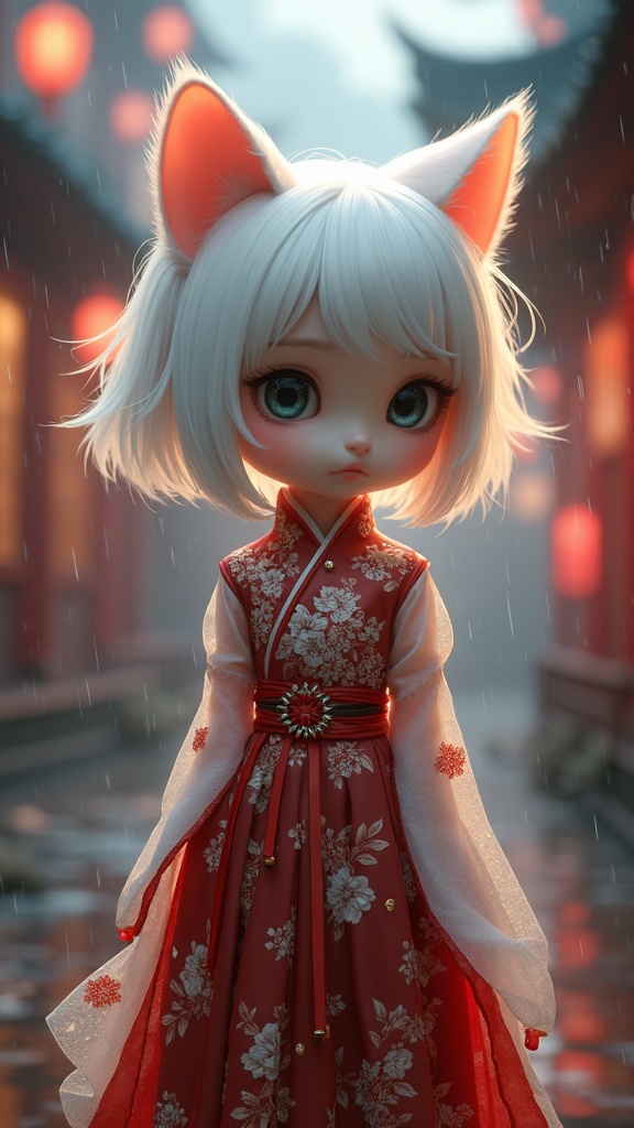 White-haired 12th-century cute cat girl wearing a traditional Chinese dress, captivating eyes, olive skin tone, short white locks, petite yet toned build, small bust, dressed in an intricately patterned red and white qipao, hyperrealism with cinematic lighting, highly detailed and breathtaking 8k UHD setting in a dark rainy city, depth of field accentuating lumen reflections, photographic clarity against a stunning CGI environment, 3D-rendered using octane, with slight creative imperfections like fuzzy outlines, occasional extra limbs or fingers, and dream-like distortions.