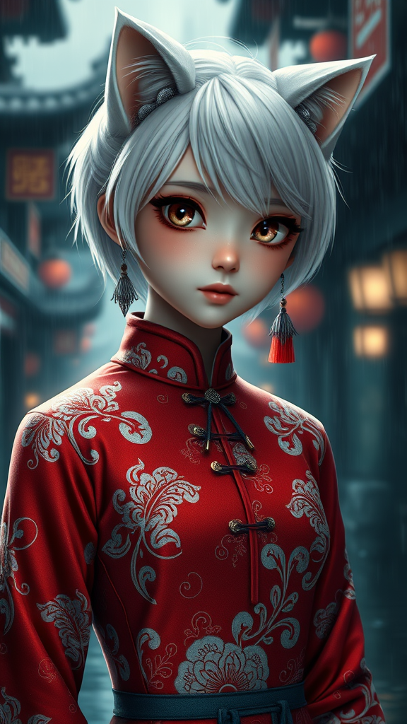 White-haired, 12th-century cute cat girl with beautifully captivating eyes and an olive skin tone, sporting short, snowy locks. Her petite yet toned physique is elegantly draped in an intricately designed red and white qipao. Set in a hyper-realistic, cinematic scene with stunning 8k UHD detail, this breathtaking vision stands amidst a dark, rainy cityscape. The environment is brought to life with depth of field, lumen reflections, and photographic CGI elements, all rendered in exquisite 3D. Despite her allure, there are hints of imperfect anatomy, with subtle distortions and peculiarities adding an intriguing layer to the visual narrative.