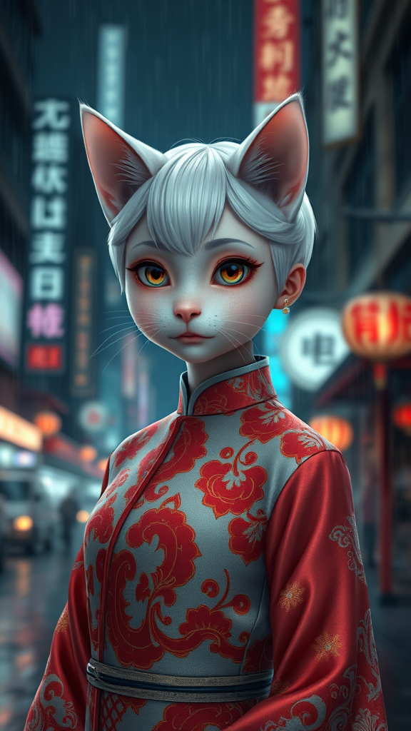 White-haired, 12th-century-inspired, adorable cat girl with striking eyes and an olive complexion, wearing a short white hairstyle and a traditional Chinese dress. Her petite and toned figure is elegantly adorned in an intricately designed red and white qipao. Set in a hyper-realistic, dark, rainy cityscape with cinematic lighting and depth of field, capturing breathtaking details in 8k UHD with stunning CGI. The atmosphere is accentuated by lumen reflections and photographic elegance, crafted using advanced 3D rendering techniques. Avoiding imperfect anatomy or disfigurements, she is a perfectly realized character within this immersive scene.