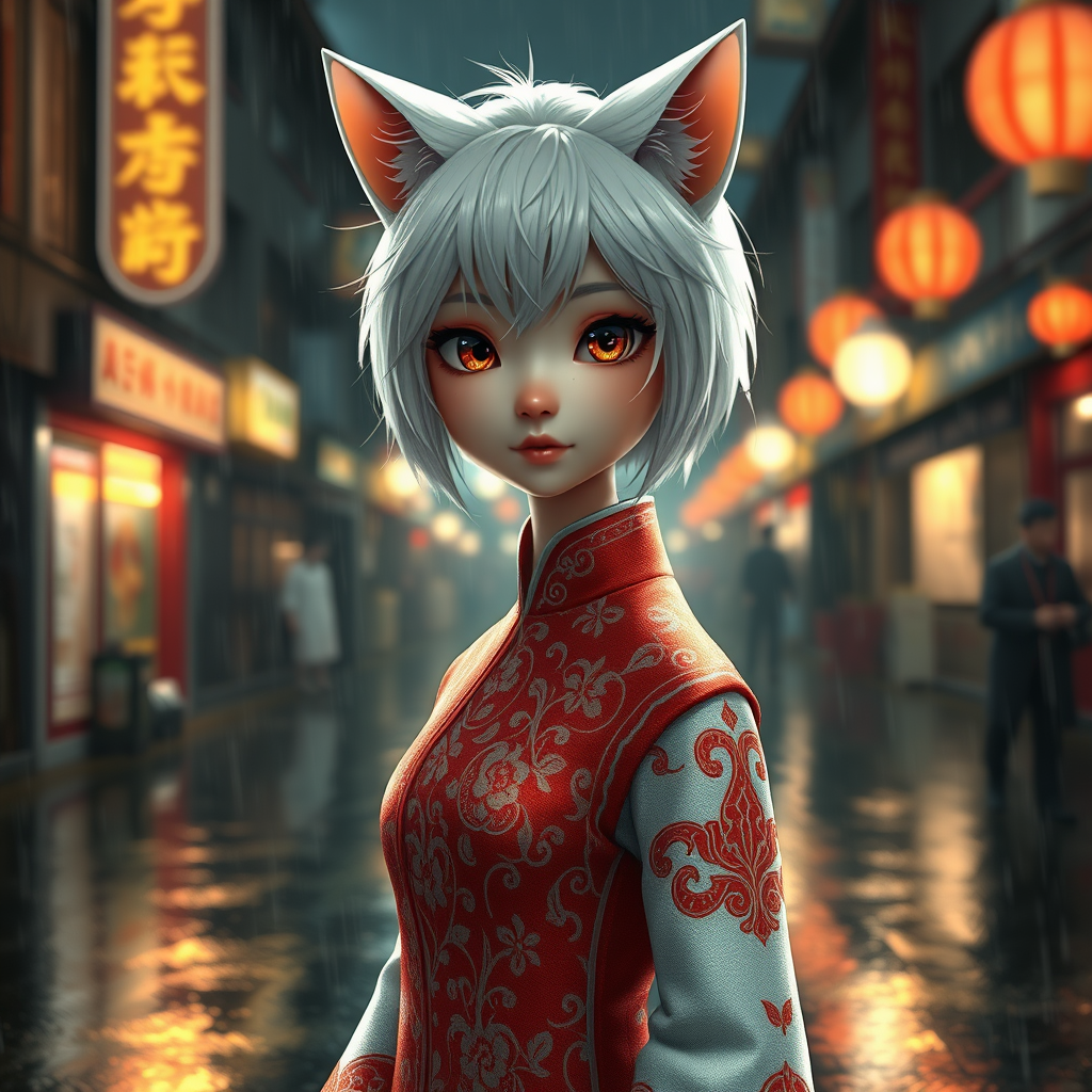 White-haired cat girl from the 12th century, adorned in a traditional red and white qipao with intricate designs. Her enchanting eyes and olive skin exude warmth, complemented by her short, stylish white hair. With a petite yet toned body, her presence is graceful and captivating. She stands in a dark, rainy cityscape that enhances her ethereal beauty, captured in hyperrealism and cinematic lighting. The scene is captured in breathtaking 8k UHD, with the rain casting shimmering reflections on the street. The depth of field adds to the allure, creating a stunning, immersive environment with CGI artistry. The city is alive with movement and shadows, capturing a sense of mystery and wonder reminiscent of a 3D animated masterpiece.