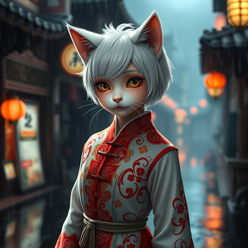 White-haired cat girl from the 12th century with an adorable charm, wearing a traditional Chinese dress. Her beautiful eyes and olive skin complement her short white hair and petite, toned physique. She wears an intricately designed red and white qipao, though it showcases a few imaginative inaccuracies in its artwork. Set in a dark, rainy, urban environment with cinematic lighting and hyperrealistic detail. The scene boasts 8k UHD quality with stunning depth of field and realistic lumen reflections, creating a breathtaking CGI atmosphere. The artistic rendering, while detailed, includes intentional quirks in anatomy, with subtle playful distortions and blurring in the background, adding a fantastical touch to the scene.