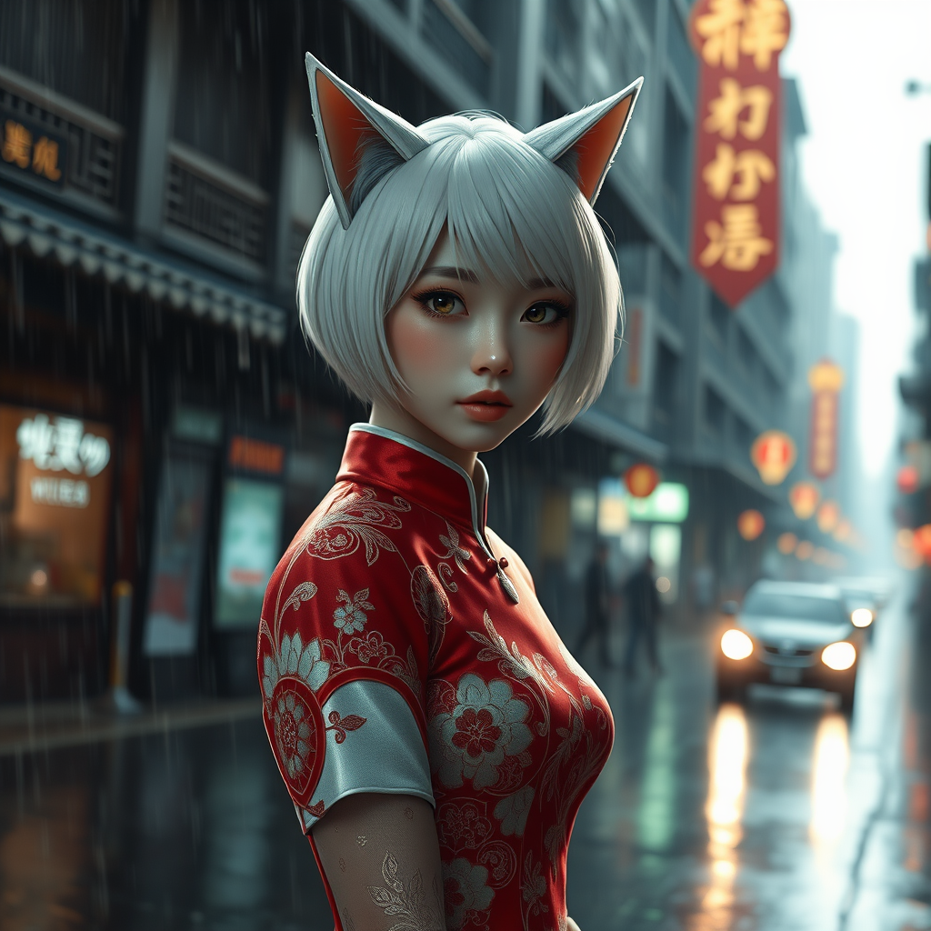 White-haired cat girl with an olive complexion and captivating eyes stands amidst a 12th-century-inspired dark, rainy city. She dons a red and white qipao, intricately designed, hugging her petite and toned frame. Her short white hair glistens in the cinematic lighting that bathes the urban landscape in hyperrealistic detail, reminiscent of 8k UHD quality. The environment, enhanced with stunning CGI and depth of field, creates lumen reflections on wet surfaces, adding depth and atmosphere. Rendered with octane precision, the scene captures the essence of a dreamy 3D world where fantasy meets reality.
