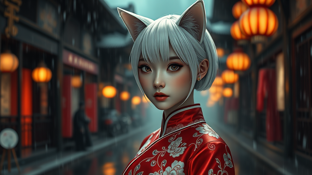 White-haired cat girl with an olive skin tone and mesmerizing eyes, dressed in a traditional red and white qipao, exuding a cinematic aura in a dark, rainy 12th century city. Her short white hair and petite, toned figure with delicate features create a stunning contrast amidst hyperrealistic, 8k UHD imagery. The environment is rich with detailed, lumen reflections, and a captivating depth of field that highlights the intricate beauty of a 3D CGI masterpiece. Surrounded by the atmospheric ambiance of rain-soaked streets, she embodies a breathtaking cinematic presence within a vividly stunning, albeit slightly surreal and dreamlike, photography setting.