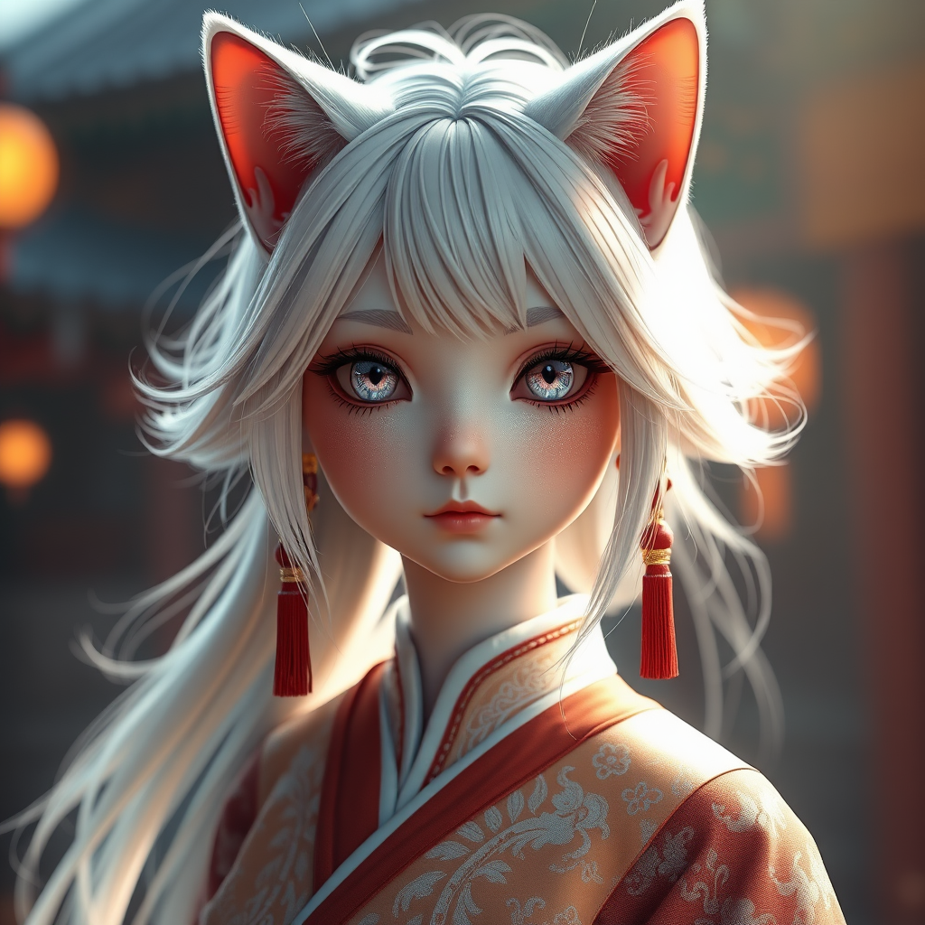 White-haired cat girl with traditional Chinese attire, featuring a highly detailed face and stunning eyes, captured in 8k ultra-realistic quality. The scene is enhanced with atmospheric lens flare and glowing cinematic lighting. The piece is intricate, vibrant, and reminiscent of trending works on ArtStation. Utilizing hyperrealistic techniques in Unreal Engine 5, the environment is both stunning and immersive, with lumen reflections and mastery in photographic realism. The 3D rendering achieves a doll-like quality, enhanced by Octane Renderer, setting the piece apart as a cinematic masterpiece. While maintaining an intricate level of detail, small creative deviations like subtle shifts in anatomy contribute to its unique charm.