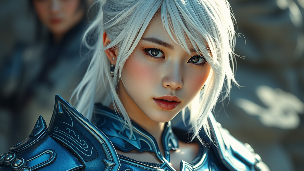 White-haired, South Korean girl with a strikingly beautiful face, wearing detailed azure armor. Her medium-length white hair frames her face elegantly, highlighting her expressive features. The armor intricately reflects light with its surprising depth and texture, reminiscent of Greg Rutkowski's hyperrealistic art style. Her toned stomach is subtly visible, revealing a confident yet graceful demeanor. Set in a hyperrealistic setting, the scene captures an ethereal beauty in stunning 8k resolution, blending mythic allure with modern elegance.