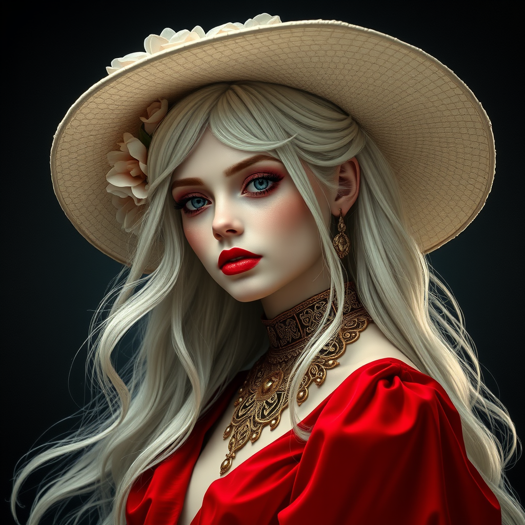 White-haired woman in a flowing red dress and an elegant white hat, adorned with intricate gold details on her face. The style evokes a blend of Gaston Bussiere, Alphonse Mucha, and Greg Hildebrandt, with hints of Tim Burton’s whimsical touch. The portrait is a dramatic headshot, capturing the essence of a goddess-like figure with an elaborate flower crown and golden filigree ornaments accentuating her neckline. The background is a mysterious, dark fantasy setting, reminiscent of a high-fashion magazine cover. The lighting is award-winning, hyper-realistic, and cinematic, enhancing the intricate details and photorealism of the piece. The artwork combines the surreal elements of René Magritte with the vibrant palette of Lisa Frank, rendered in a high-resolution, 4k quality resembling the finish of an oil painting, but with the sharpness and clarity of an octane render in an unreal engine. The atmosphere is one of enchanting beauty, elegance, and otherworldly charm.