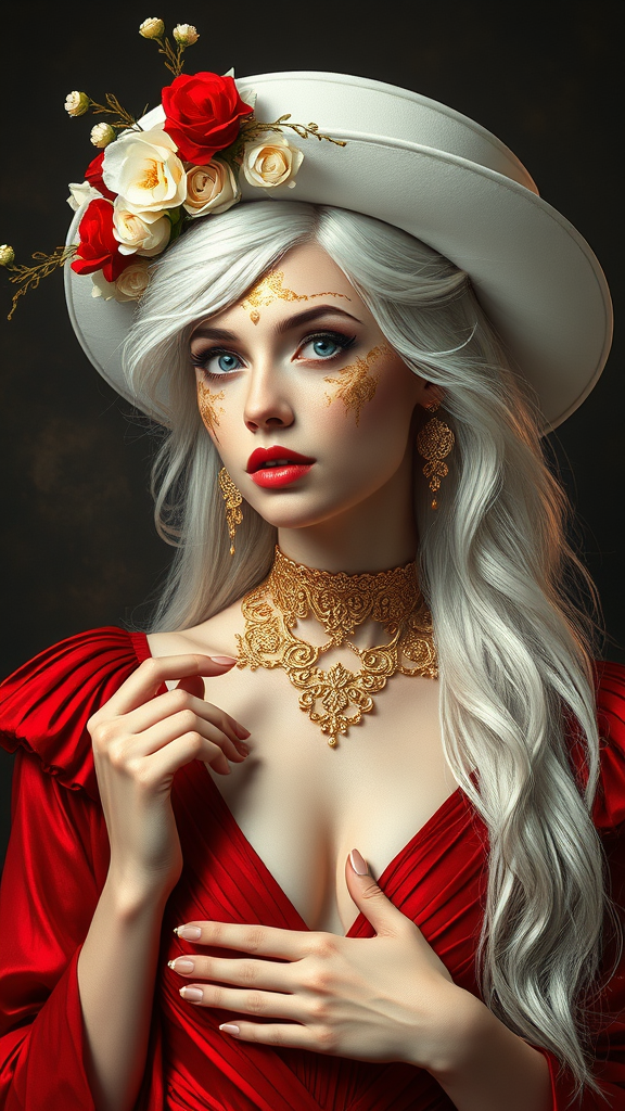 White-haired woman in an elegant red dress paired with a stylish white hat featuring intricate gold details on her face, inspired by the artistic styles of Gaston Bussiere, Rutkowski, Mucha, Greg Hildebrandt, Tim Burton, Ivan Albright, Michael Whelan, Paul Klee, WLOP, Lisa Frank, Rene Magritte, and Gustav Dore. Positioned in a dark fantasy background akin to a high-fashion magazine cover with award-winning dramatic and cinematic lighting, the scene captures a hyper-realistic and highly detailed depiction in 4K resolution. The woman, embodying the ethereal beauty of a goddess, wears an intricate floral crown and holds golden filigree ornaments, accentuating her neckline. The artwork is a blend of photorealism and digital painting, employing elements of oil paint and ink splash. The portrayal avoids any elements of distortion or poor quality, ensuring a perfect focus and stunning visual clarity.