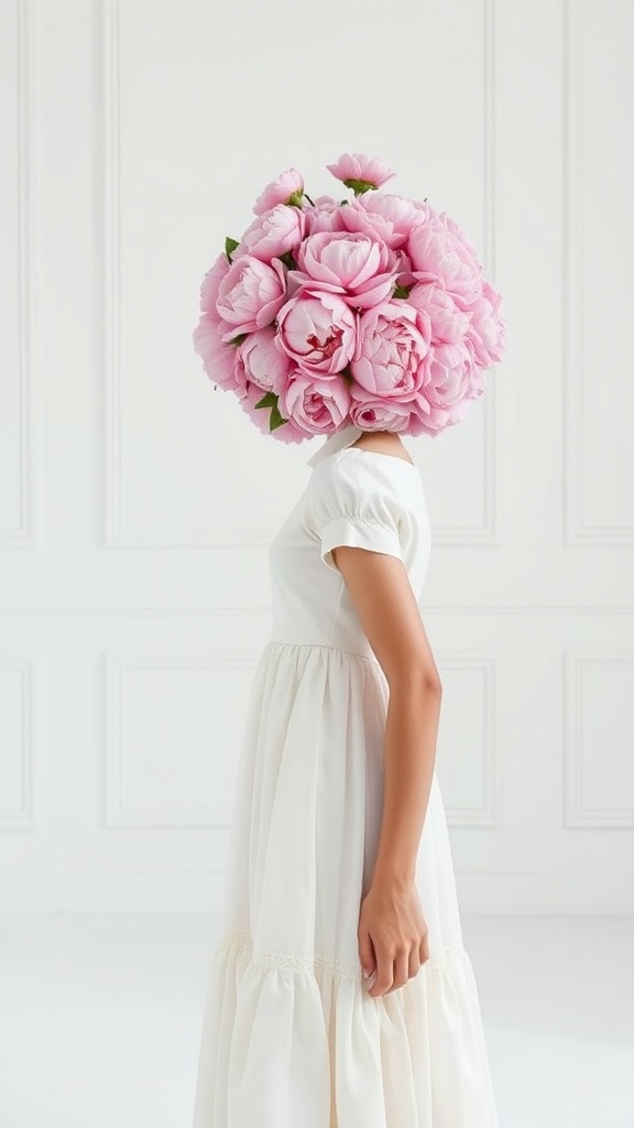View this AI-generated image featuring white minimalist room featuring a girl in a dress with her head entirely adorned with pink peonies captured in two highly detailed photographs the setting exudes serene simplicity with the room s elegance providing a gentle contrast to the vibrant intricacy of