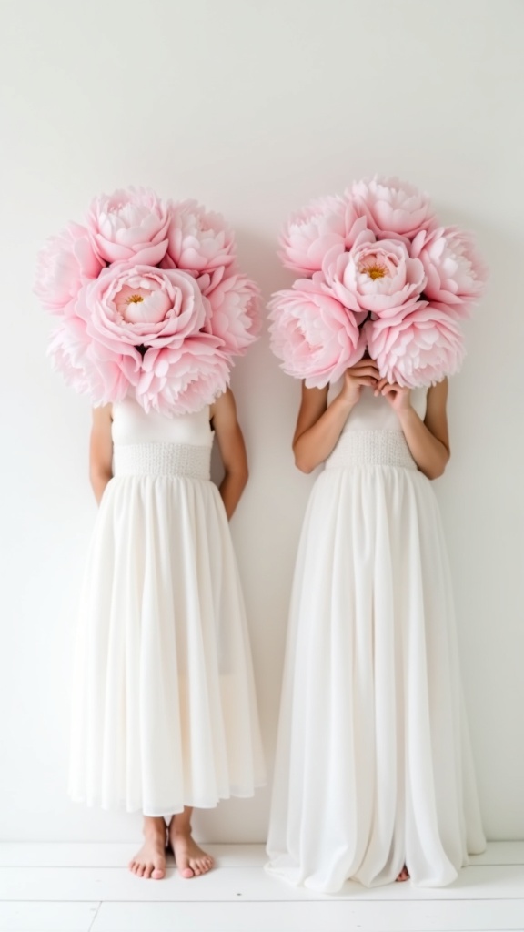 A serene white minimalist room featuring two girls in elegant dresses, their faces beautifully obscured by abundant blooms of pink peonies, captured in two high-detail photographs, maintaining an ethereal and dreamlike quality with a soft focus on the floral elements, set in a delicate 4:5 aspect ratio.