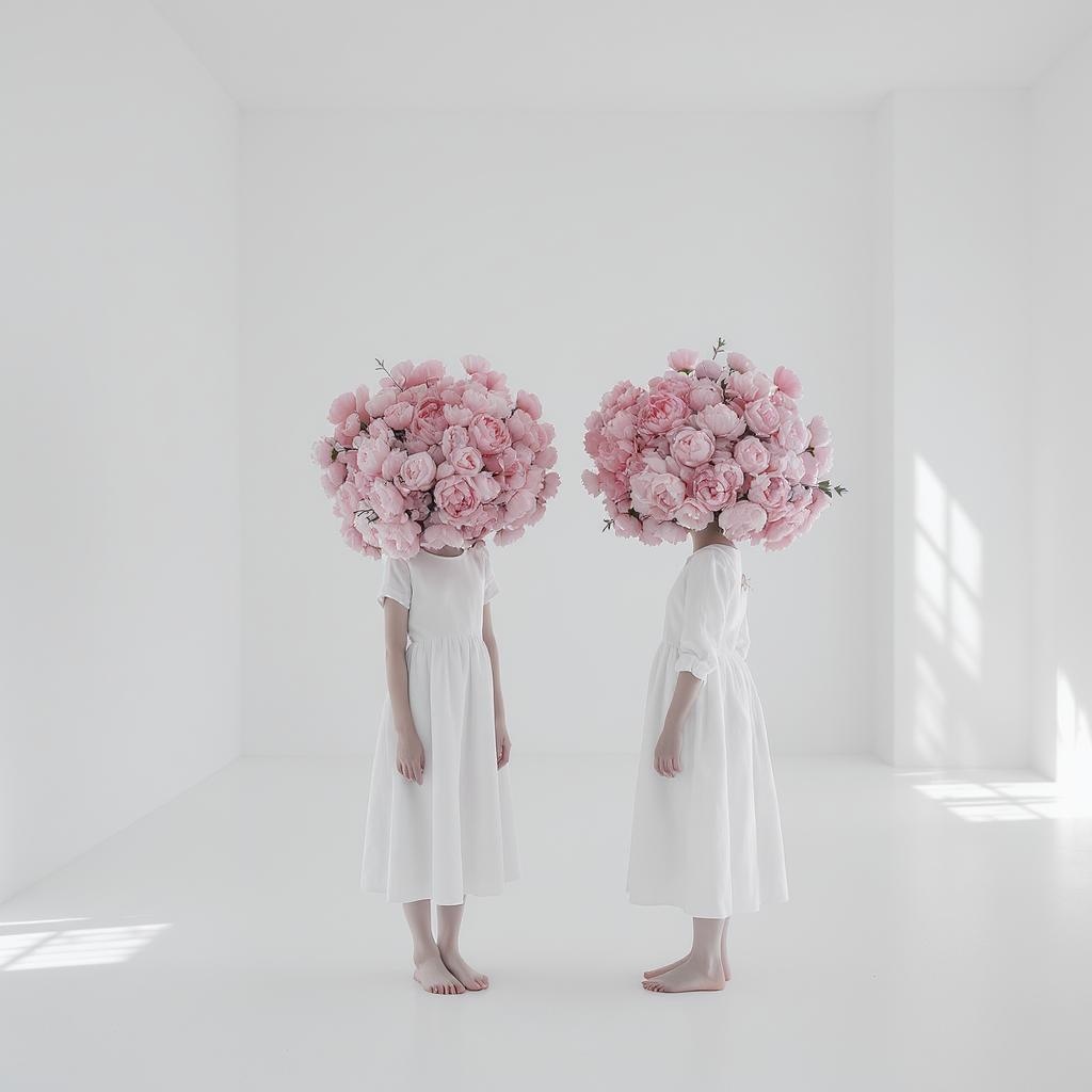 White minimalist room, bare and expansive, illuminated by natural light, features in the foreground two girls, each wearing a simple, elegant dress. Their heads are entirely adorned with lush, blooming peonies in varying shades of pink. The softness of the flowers contrasts subtly against the crisp surroundings. The scene captures the ethereal beauty and tranquility of this unique juxtaposition.