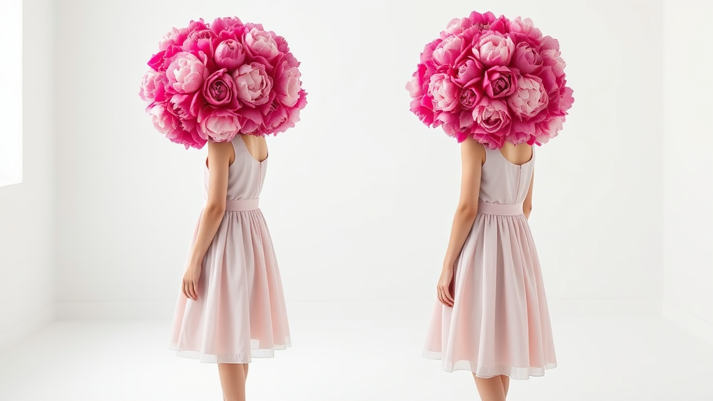White minimalist room, completely empty; two girls in dresses, heads entirely enveloped with vibrant pink peonies, against a backdrop; two high-detail photographs -- aspect ratio 4:5.