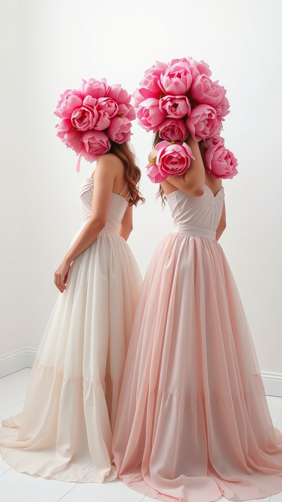 White minimalist room with bare walls and soft lighting, featuring two girls in elegant dresses, their heads completely adorned with vibrant pink peonies, capturing a sense of mystery and beauty. High detail photography showcases the texture of the flowers and fabric, maintaining a balance between simplicity and intricate design. Aspect ratio 4:5.