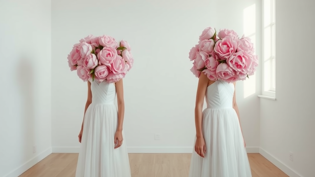 White minimalist room with bare walls and soft natural light, two girls in elegant dresses with their heads entirely enveloped by lush pink peonies, creating a surreal and otherworldly appearance, two highly detailed photographs capturing the serene yet whimsical atmosphere -- aspect ratio 4:5.
