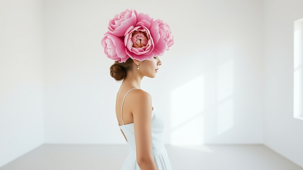 White minimalist room with bare walls girl in an elegant dress head adorned with lush pink peonies two photos high detail natural light soft shadows airy ambiance ar 4:5