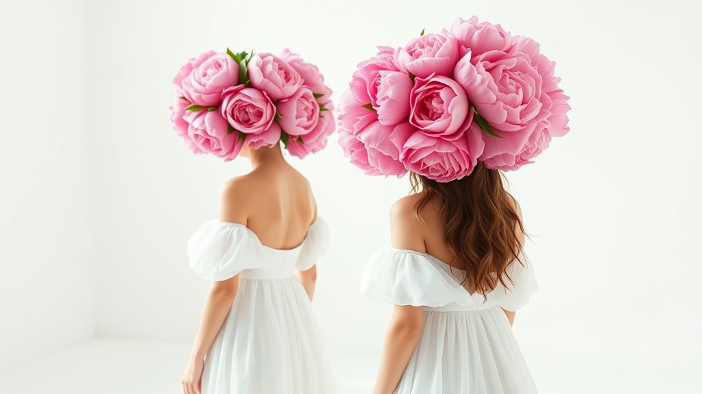 White minimalist room with bare walls two girls in flowing dresses heads adorned with lush pink peonies vivid detail soft natural light creating a serene ambiance elegant simplicity envelops the scene emphasizing the delicate beauty of the flowers and fabric