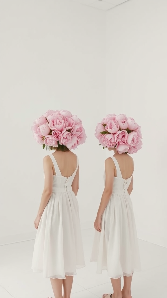 White minimalist room with bare walls two girls in dresses their heads adorned with clusters of blooming pink peonies highly detailed photos ethereal atmosphere soft lighting airy ambiance gentle floral contrast against the starkness of the room.