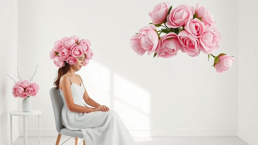 White minimalist room with simple decor girl in an elegant dress head adorned entirely with lush pink peonies high detail soft lighting ar 4:5 one girl seated gracefully on a chair and another gracefully standing both exuding serenity and ethereal charm