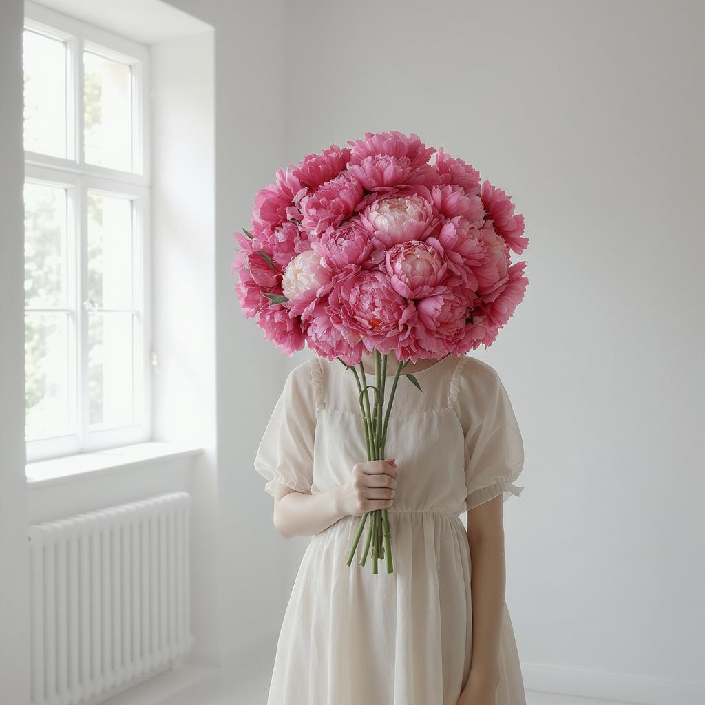 White minimalist space featuring a girl in a flowing dress, her head entirely obscured by vibrant pink peonies, two high-detail images capturing the serene yet surreal atmosphere, aspect ratio 4:5, adding a touch of natural light streaming through a large window to enhance the scene.