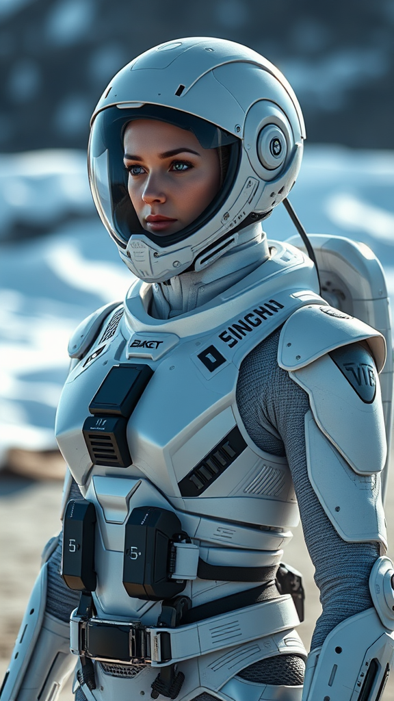 White sci-fi female armor with a sleek cybernetic helmet and full-body protective suit, complemented by insulated materials resembling a spacesuit. The intricate design showcases a bald head peeking beneath the helmet, emphasizing fine craftsmanship and detail. Captured in an outdoor setting, the photograph uses natural light to highlight the photorealistic and cinematic aesthetics. With a focus on cinematic rendering and ray tracing, the image is produced in ultra-HD, offering the highest quality and detail. The scene is portrayed from a third-person perspective, utilizing blur and long exposure effects to enhance the dramatic and moody lighting, reminiscent of a high-budget sci-fi movie. The aspect ratio is set to 9:16, ensuring a tall and immersive composition.