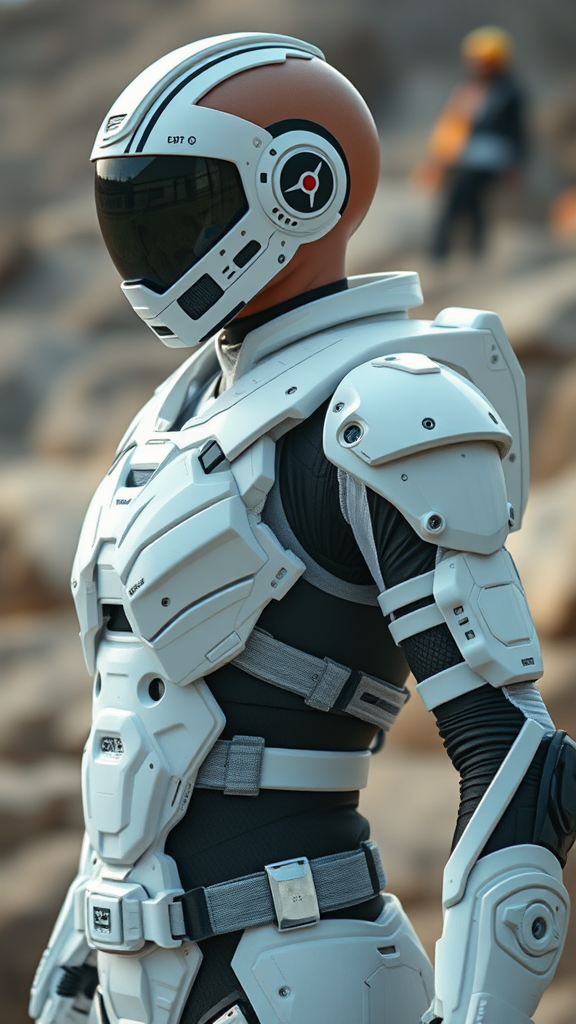 white sci-fi female armor with an intricate cybernetic helmet, full-body insulated spacesuit, showcasing a bald head, featuring exceptional fine detail and a style reminiscent of a sci-fi movie, captured outdoors in a photo with natural light, emphasizing photorealism and cinematic rendering with advanced ray tracing, ensuring the highest quality and detail, viewed from a third-person perspective, incorporating a subtle blur effect and long exposure in pristine 8K Ultra-HD resolution, with a focus on natural and moody cinematic lighting.