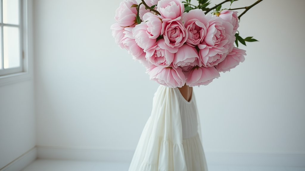 White serene room minimalistic essence girl in flowing dress her head adorned and obscured by lush pink peonies intricately detailed capturing ethereal atmosphere ambient light soft shadows gentle nuances high-focus photography aspect ratio 4:5.