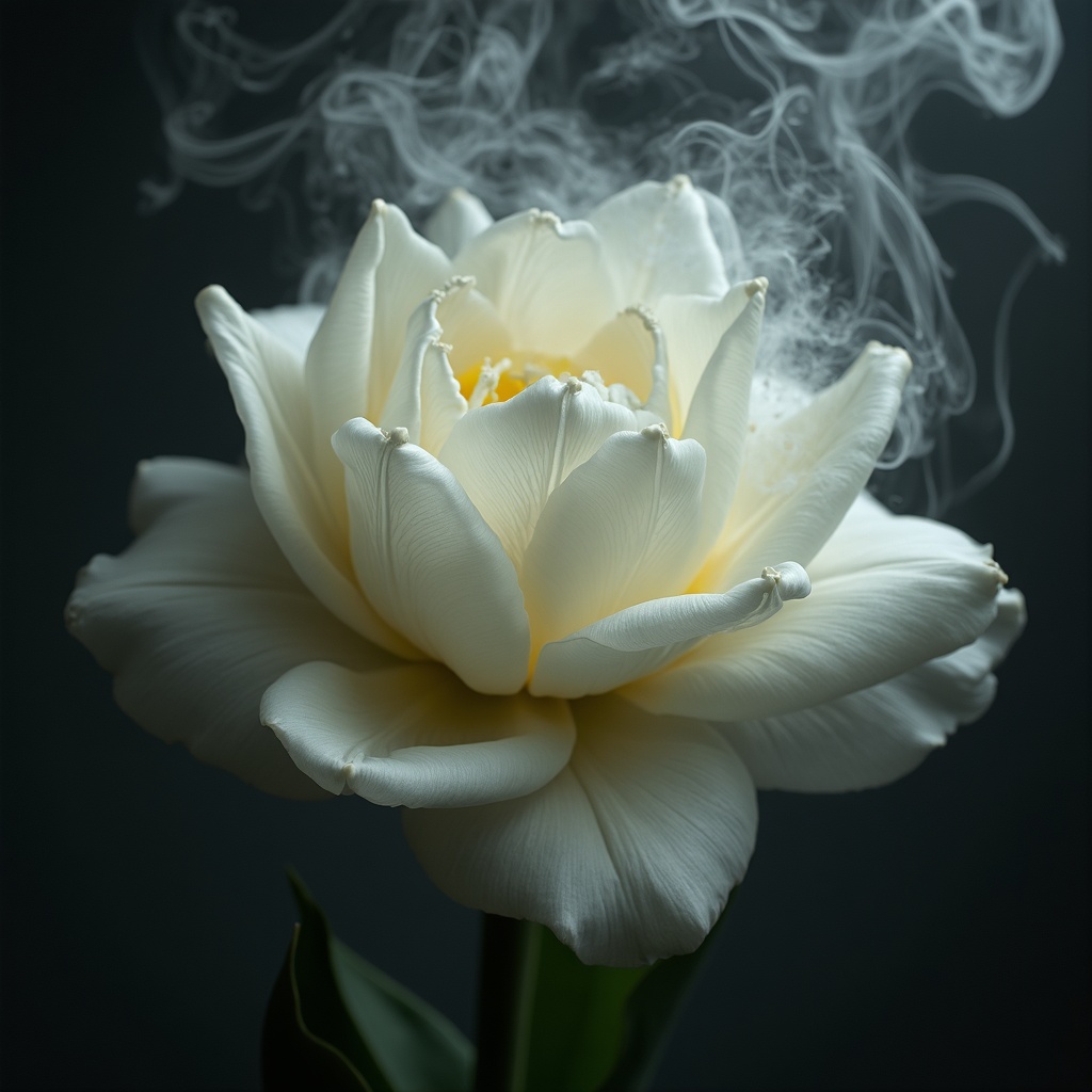 View this AI-generated image featuring white tulip bouquet unfurling ethereal smoke swirls refined botanical elegance fluid motion inspired by raphael and caravaggio surreal and dreamlike hauntingly captivating a moody ambiance timeless beauty intertwined with shadow and light intricate details blen