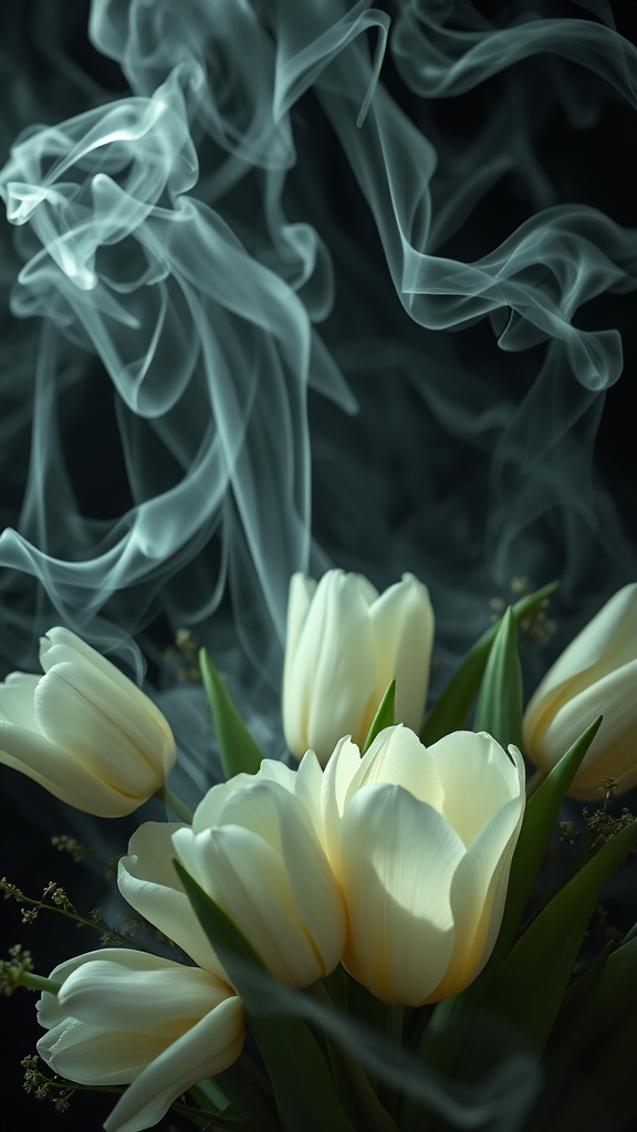White tulip bouquet unfolding, ethereal smoke swirls, refined botanical elements, vibrant interplay, reminiscent of Raphael and Caravaggio, surrealistic yet dreamlike, hauntingly exquisite, atmospheric and moody ambiance.