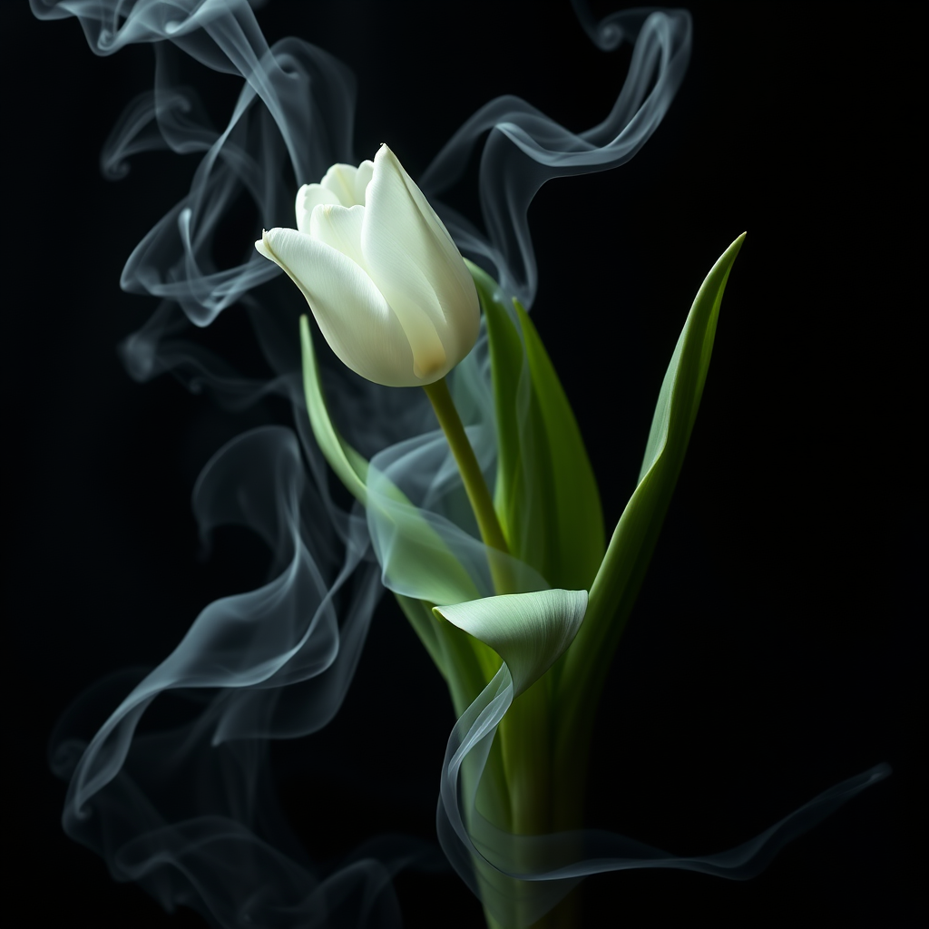 White tulip bouquet unfurling, ethereal smoke tendrils, sophisticated botanics, fluid dynamics, evoking Raphael and Caravaggio, surreal and dreamlike, haunting beauty, moody atmosphere, interplay of light and shadow.