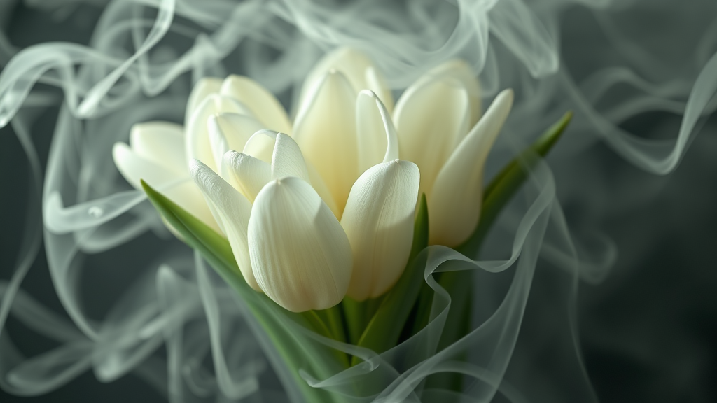 White tulip bouquet unfurling, ethereal wisps of liquid smoke swirling, refined botanical elegance, fluid motion, reminiscent of Raphael and Caravaggio, surreal dreamscape, enchantingly beautiful, atmospheric and moody.