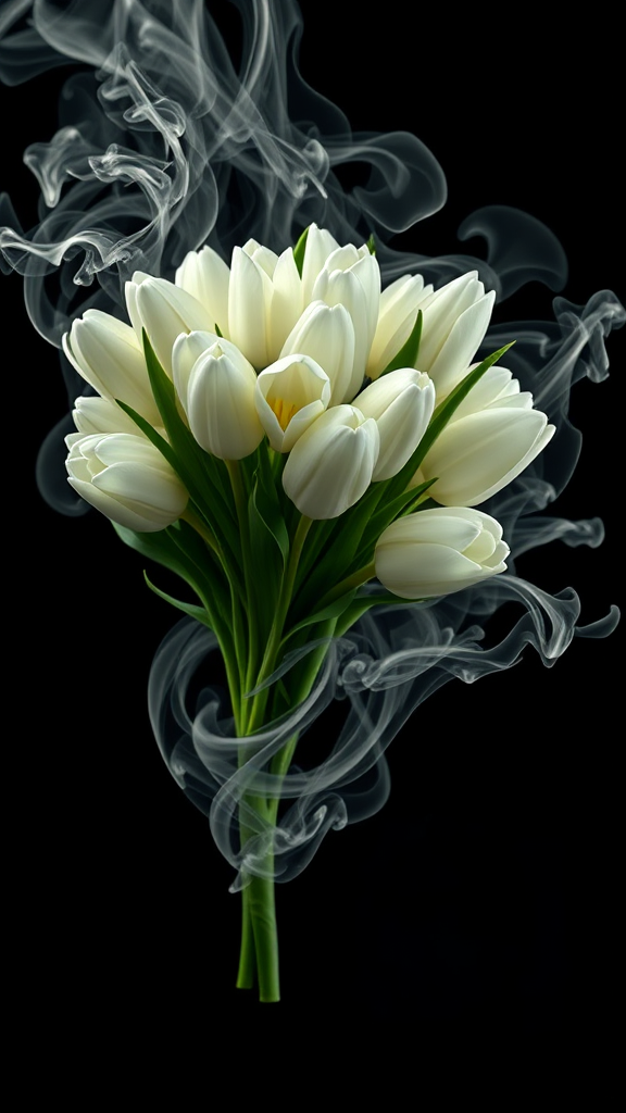 White tulip bouquet unfurling with tendrils of liquid smoke forming intricate fractals, blending elegant botany with dynamic movement and enveloping the scene in a Raphael and Caravaggio-inspired surrealism, evoking a dreamy, hauntingly beautiful atmosphere, moodily compelling with an ethereal allure.