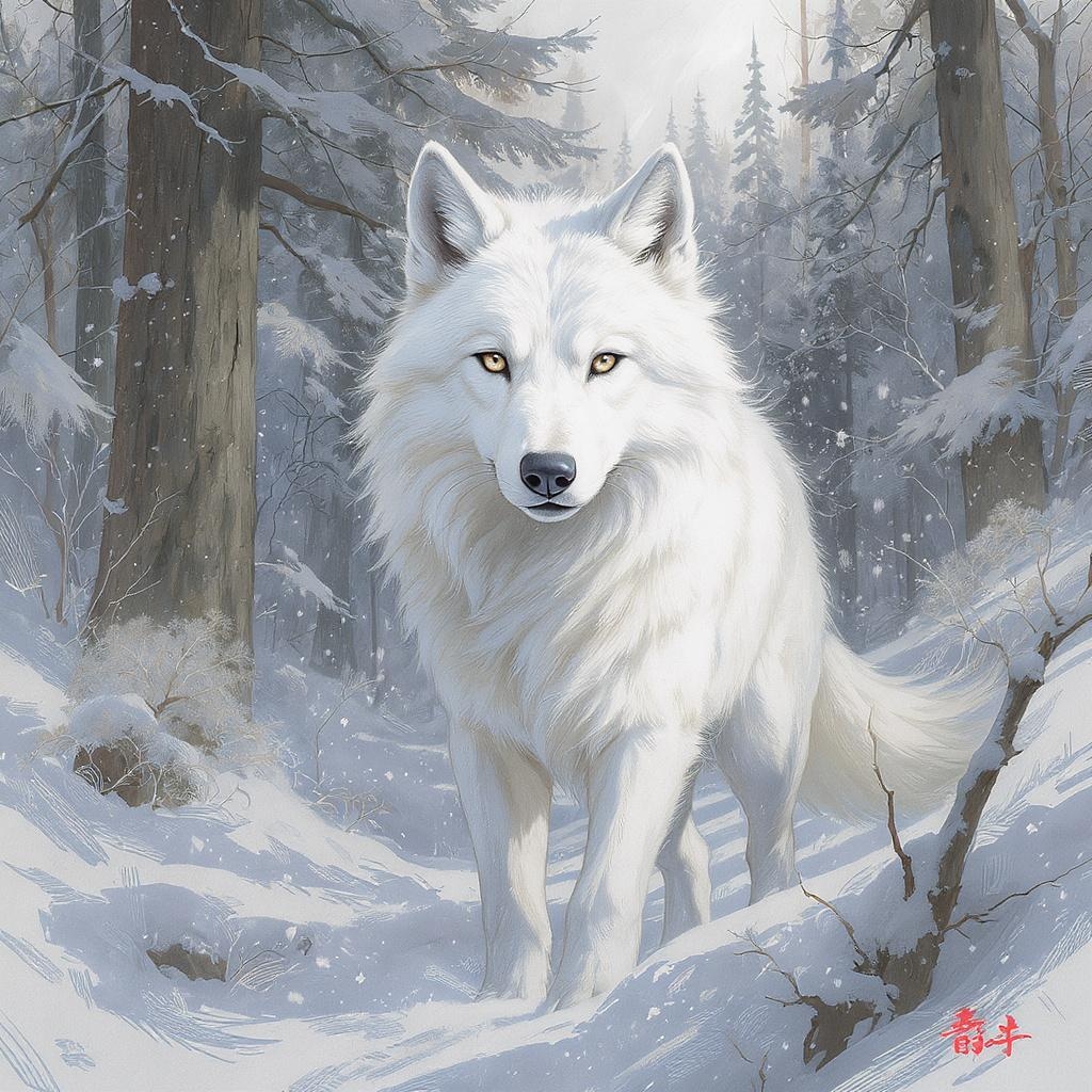 White wolf in a snowy forest setting, capturing the essence of concept art and anime in a 2D painting style. The portrait features a full body image with the wolf in a dynamic pose, complemented by an engaging and vibrant background. The expressive and artistic style brings the scene to life, with a focus on intricate details and dynamic composition, evoking a sense of adventure and mystique.