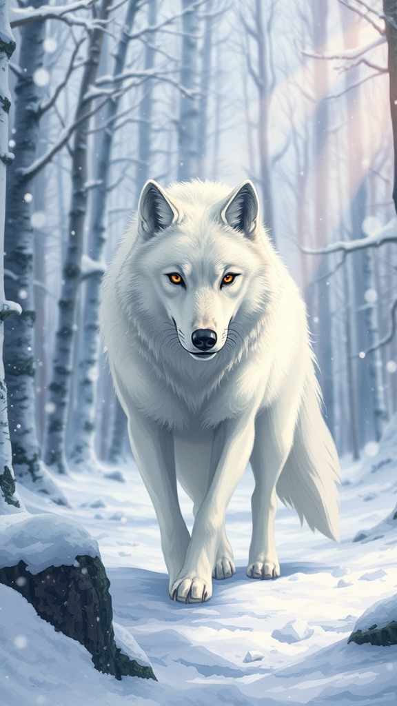White wolf in a snowy forest, full body image in an expressive anime style with dynamic pose and background, 2D concept art painting, capturing the energy and grace of a majestic creature amidst winter's chill, soft snowflakes falling, play of light and shadow through the trees, emphasizing the wolf's piercing gaze and powerful presence, --ar 4:7 --s 500 --style expressive --q 2 --niji 5.