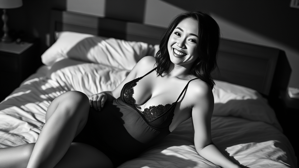 Whole body photograph of a stunning woman in revealing nightwear on the bed, with an alluring smile, captured in daylight with deep photography style. The image utilizes Ilford HP5 film in black and white, featuring crushed blacks and a noticeable depth of field. It has a dark, shadow-rich composition with pronounced film grain and natural light. Includes a subtle watermark and signature. The subject is a Chinese woman with unique artistic interpretations, slightly exaggerated features, and an avant-garde twist.