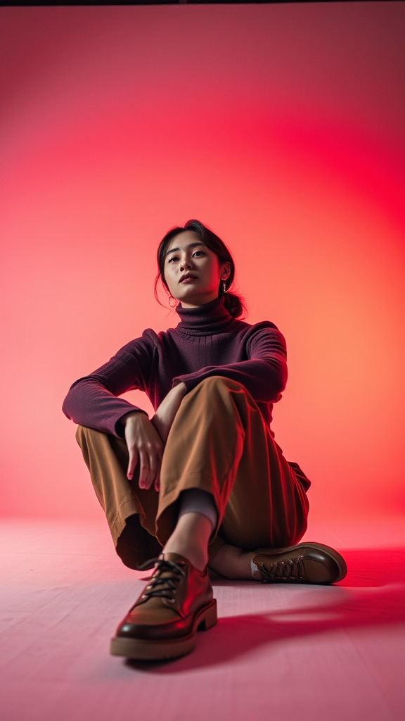 Wide and low angle cinematic fashion photograph for Uniqlo, featuring a woman seated on the floor, donned in a Uniqlo Heattech top and stylish brown chinos. The backdrop showcases a vibrant gradient of red, pink, and orange hues, creating a warm and inviting studio atmosphere. Subtle creative elements enhance the scene, capturing a sense of modern elegance and comfort while maintaining the essence of the original concept.