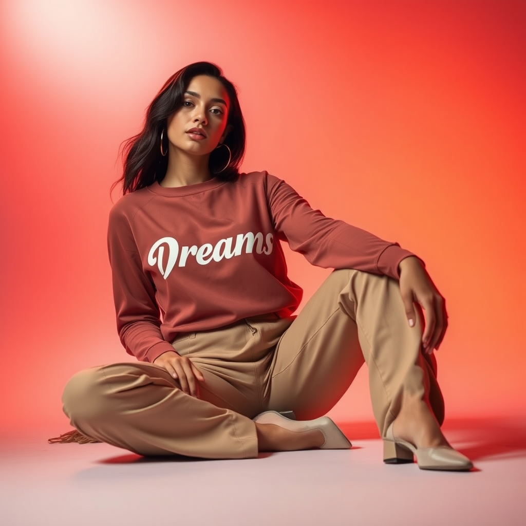 Wide and low angle cinematic fashion photography featuring a woman sitting elegantly on the floor, showcasing a Dreamshot heattech top with an oversized "Dreamshot" logo emblazoned across the chest. She pairs this chic top with stylish beige chinos. The ambiance is set against a captivating gradient backdrop that seamlessly blends shades of red, pink, and orange in a sophisticated studio setting, adding a vibrant and dynamic edge to the scene. The overall composition emanates modernity and flair while highlighting the essence of the Dreamshot brand.